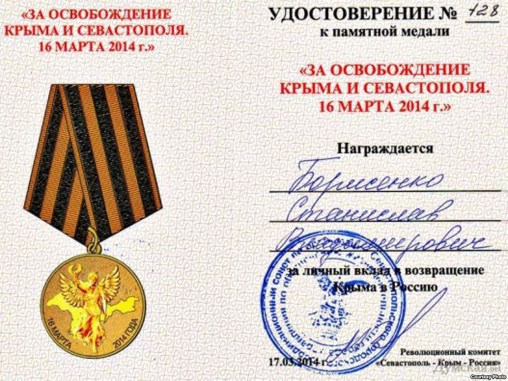 "Командир полка Народного ополчения Республики Крым Сергей Турчаненко вручил главе администрации Симферополя Геннадию Бахареву медаль «Святого Георгия».