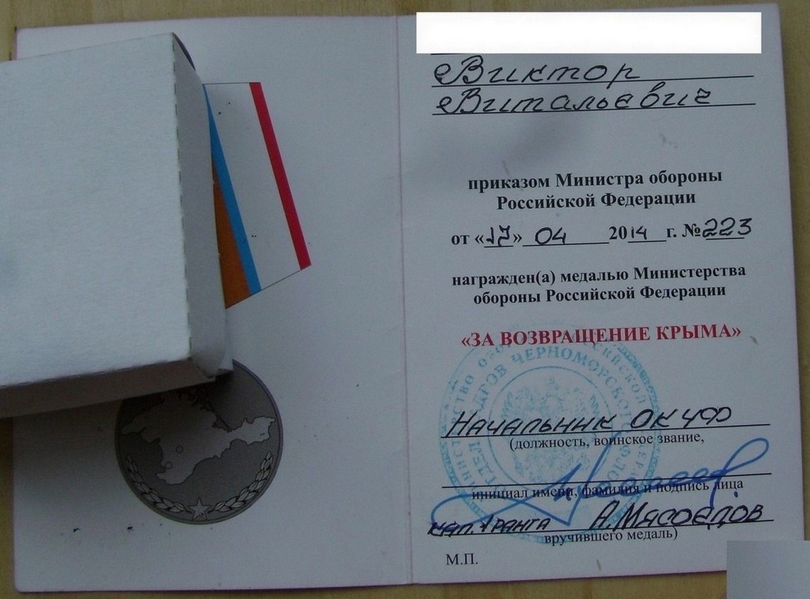 Вторым награжденным стал атаман ККВ, вице-губернатор Николай Долуда. Он получил награду из рук подчиненного под №003 в пятницу, 1 августа 2014 г.