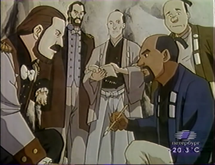 на первом :министр, подписавший Договор от имени японского правительства Бакуфу, того времени, господин Тосиакира Кавадзи и российский посланник вице-адмирал Е.В. Путятин с надписями на японском и русском языках.
