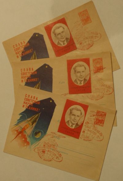 Похоже эти значки и сохранились в основном на конвертах. Пересечение филателии и фалеристики.BoB_Dimon писал(а) :Бумажный значок с портретом Г.С.Титова, уже показан на этой странице, а теперь покажу конверты с наклеенными на них значками и со спецгашением, по случаю полёта корабля "ВОСТОК-2". Не так много этих значков-листовок осталось, а тут 3 конверта с одинаковыми наклейками в дополнение к марке.