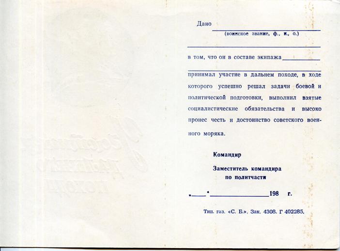 А вот чистый бланк Удостоверения "Участнику дальнего похода, вручавшийся на Дважды Краснознаменном Балтийском флоте,