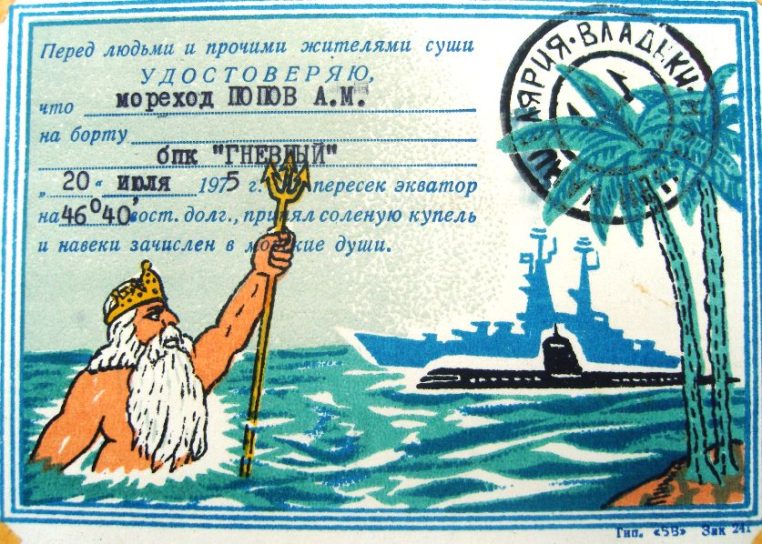 .Фото и удостоверение "Переход экватора" -карта маршрута...(док..так же как и Военный билет ) любезно предоставлены ПОПОВЫМ АЛЕКСАНДРОМ МИХАИЛОВИЧЕМ военнослужащего В/Ч 42806. БПК "ГНЕВНЫЙ" КТОФ-годы службы на корабле с 1973 -1976 гг...