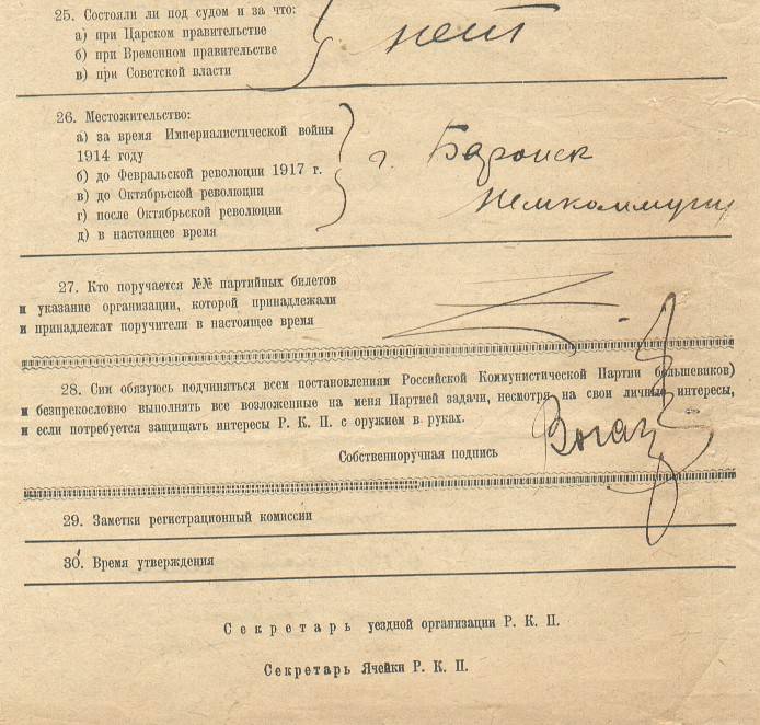 1926г. – принято решение снова обменять партбилеты. Сам обмен происходил весной 1927г. партия стала именоваться ВКП(б). В 1929 г. проведена очередная чистка коммунистов, прошедшим чистку вклеивалась соответствующая марка «ВКП(б) ПРОВЕРКА 1929 г.».