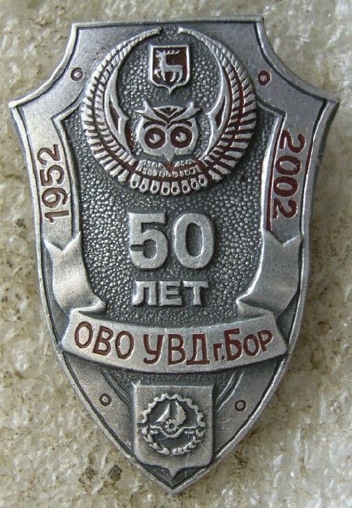 А реверс знака показать можете? Также интересует: какой металл, способ крепления, производитель, тираж, размеры.Y-Ola писал(а) :50 лет ОВО УВД г.Бор (Нижегородская область). 1952-2002