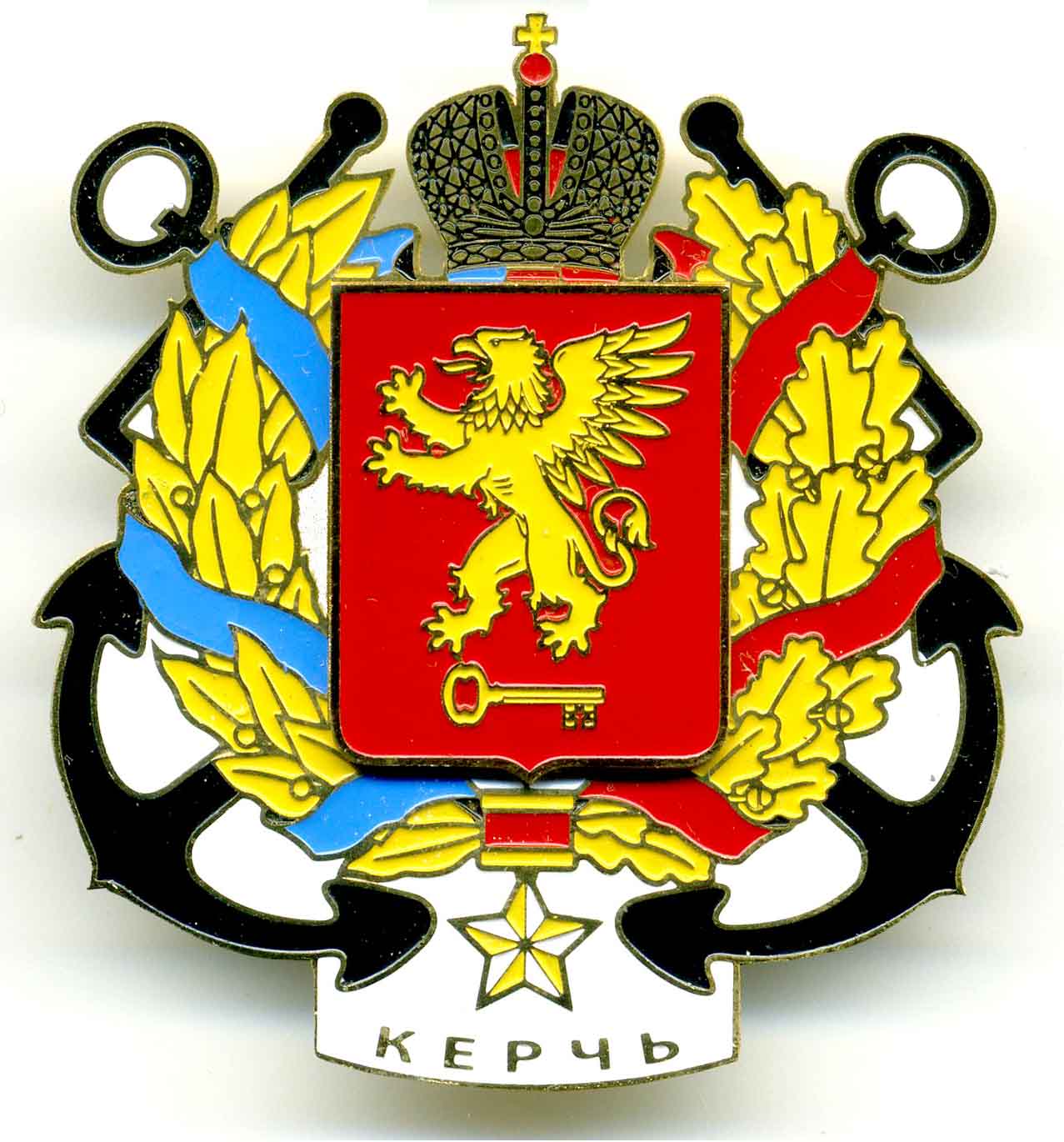 На значке два герба: проект, предложенный князем Потёмкиным и постсоветский вариант.