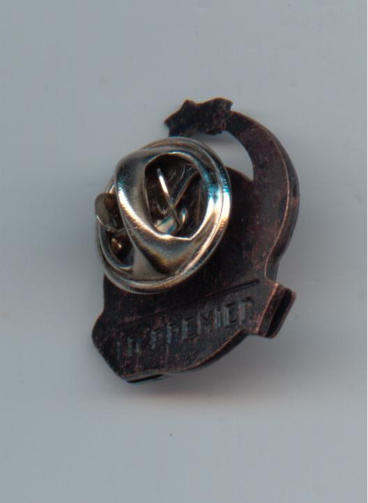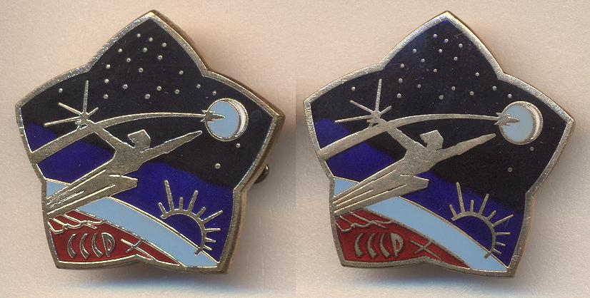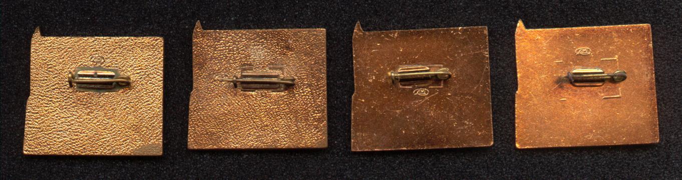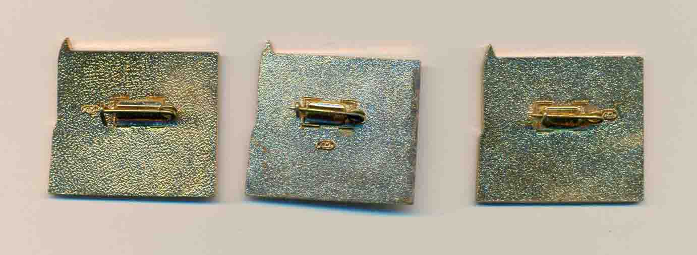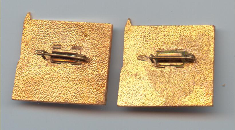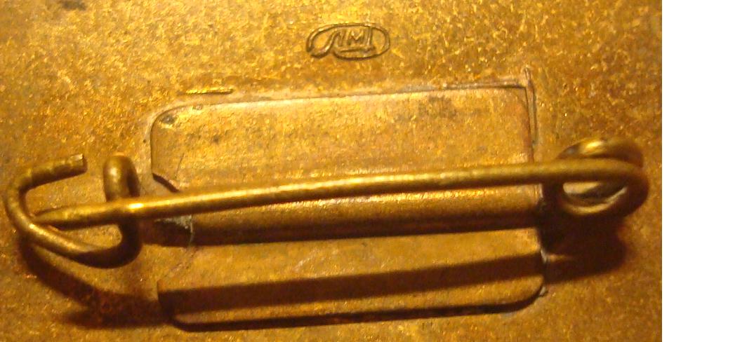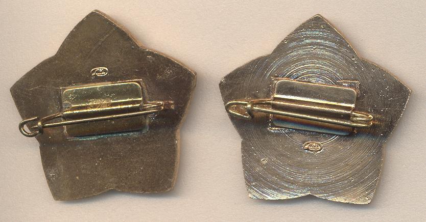 присутствует на этих знаках. Если с них удалить пластину булавки и припаять штифт, получится крепление аналогичное вашему, но уже с "местом