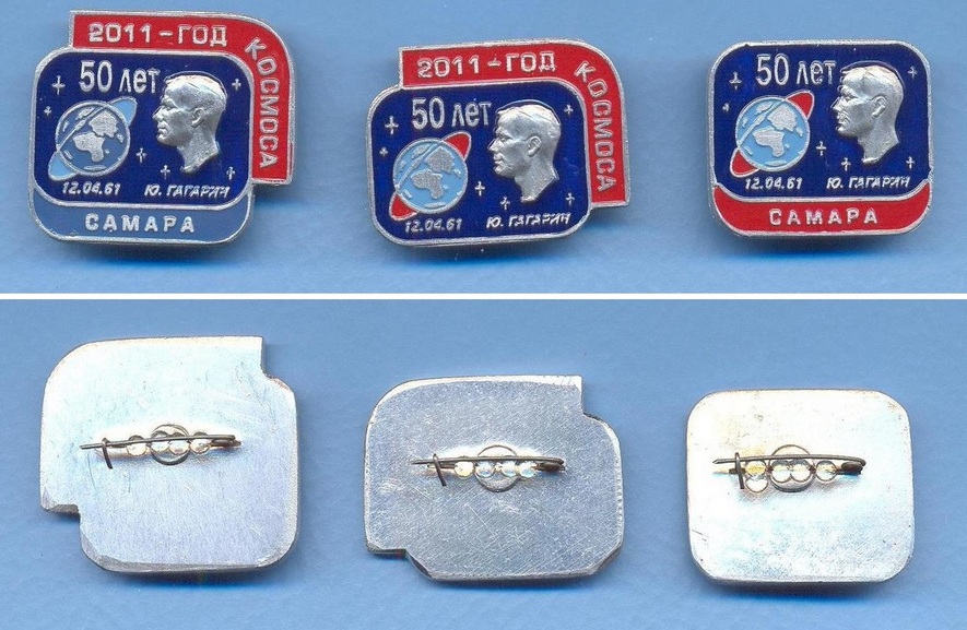 Медаль к 60 летию полёта Гагарина выпущена в трёх вариантах, отличающихся по металлу ( латунь и мельхиор) и по цвету надписи и памятника.