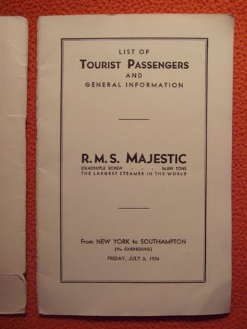 1. Passenger List (список пассажиров), со всякой полезной в дороге информацией, вроде расписания работы парикмахерских и репертуара сопровождающего ужин оркестра. Первая страница отвалилась от времени. Размер 21х13,5см