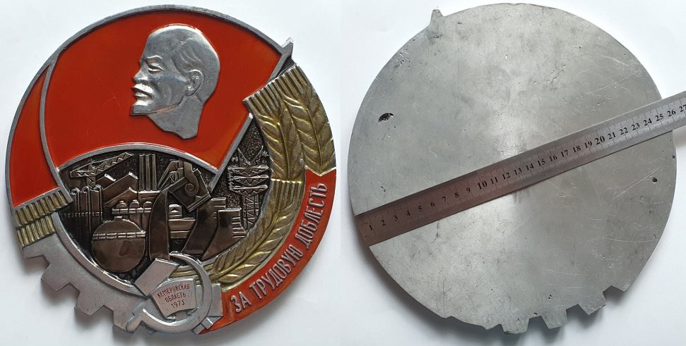 Встретился на моем жизненном пути вот такой предмет, своеобразная увеличенная копия редкого нагрудного советского знака. Думаю коллективная награда. Плакетка находилась в бывшем музее бывшего орденов Ленина и Трудового Красного Знамени Рыбинского завода полиграфических машин и я успел её перехватить перед тем, как оставшиеся после разгрома музея экспонаты отправились на свалку.