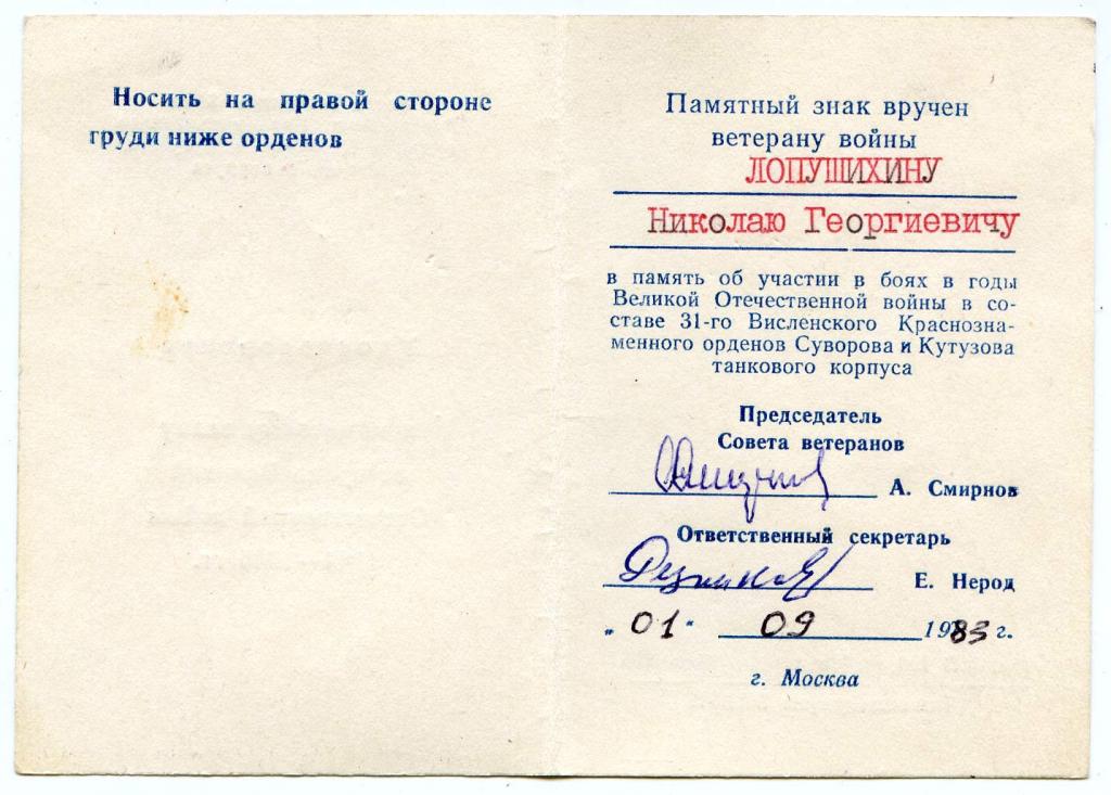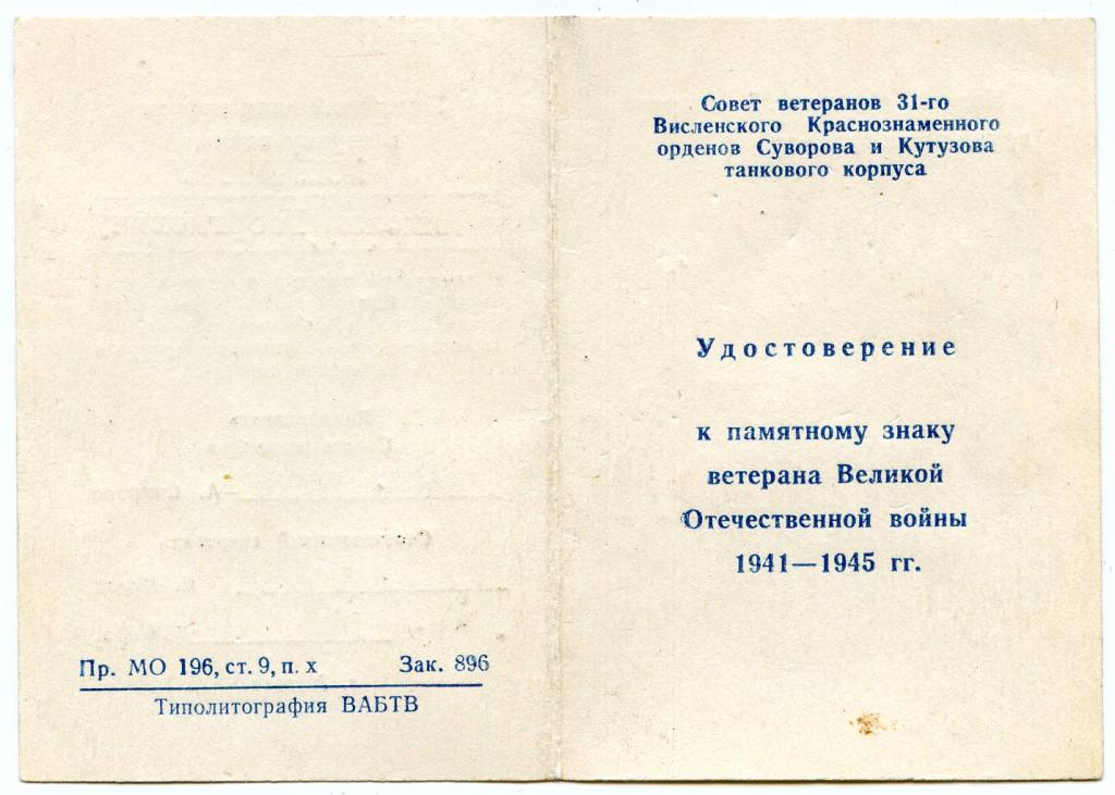 Тогда еще вопросик. Знак "Ветеран 31 ТК" представлен с надписью Висленский. У меня вариант похожий, но слегка отличается, и надпись уточнена - Вислинский.