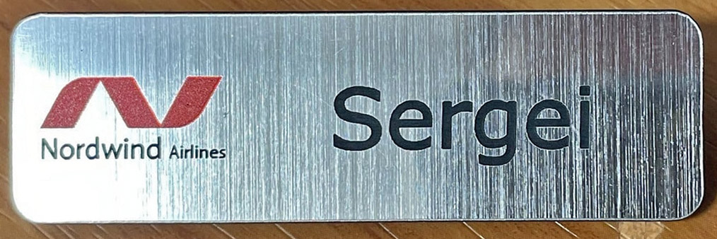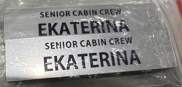 Однако в конечном итоге было выбрано другое оформление: вместо логотипа на бейджах разместили новый элемент фирменного стиля авиакомпании - силуэт пролетающего самолёта с инверсионным следом красного цвета. Как видно на фото снизу, бейджи простых бортпроводников предполагалось выпускать без каких-либо надписей, а бейджи старших - с русскоязычной надписью "старший бортпроводник":