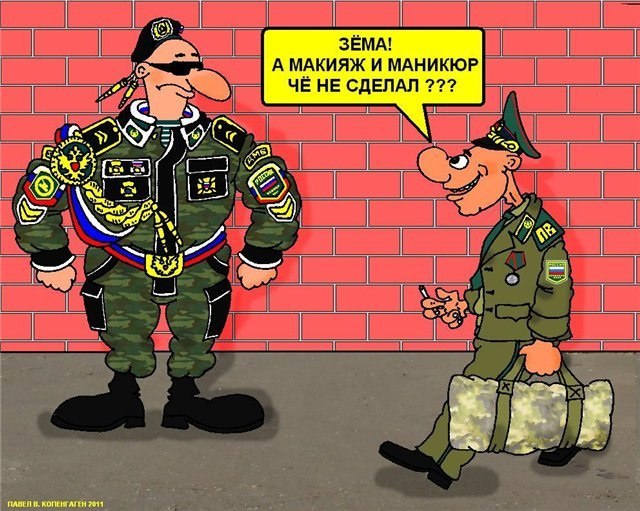 Как мне рассказывал мой папа, последние пол года ( а тогда служили два), "старики" только этим и занимались, причем в ночное время на них пахали молодые. Хотя дембельский "прикид" в то время был намного скромнее. Вспомнился фильм "Комедия строгого режима", там есть такая сцена.Титан писал(а) :Я просто не понимаю откуда столько времени, чтобы заниматься таким идиотизмом..