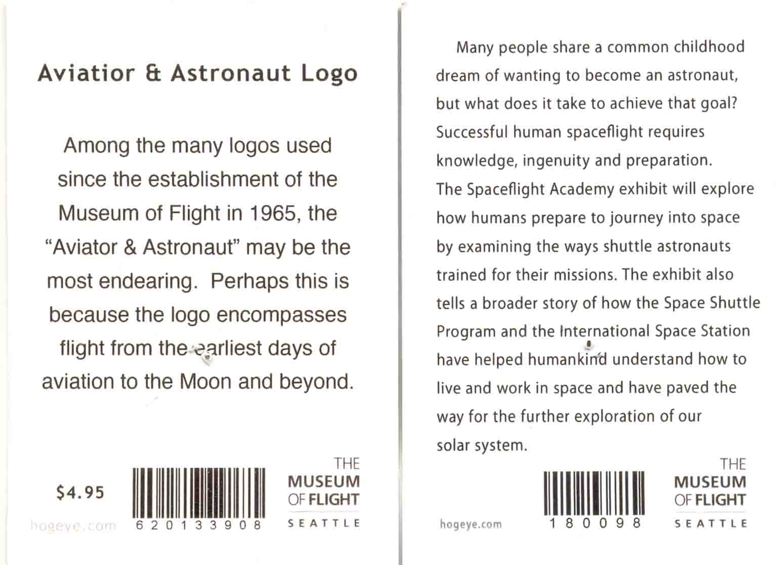 Два значка и этикетки к ним из аэрокосмического музея (The Museum of Flight, Музей Полетов) в Сиэтле.