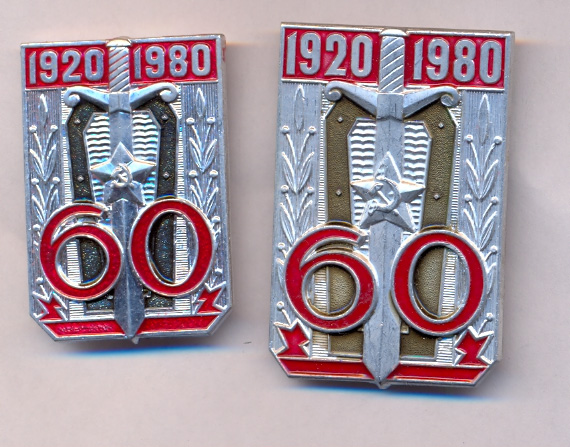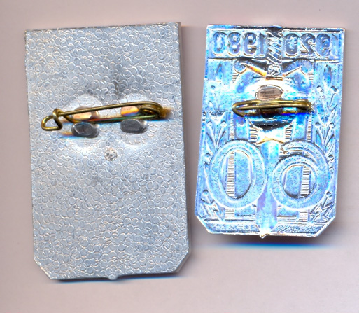 ИМХО. Интересна история появления этого знака. Кроме анадировки алюминия в белый и золотистые цвета я встречал этот знак из тяжелого металла (что-то вроде латуни). Сначала это были только накладки, а вовсе не знаки. Но потом решили приделать заколки и получился знак. Но это уже делалось не по заказу Конторы, а в частном порядке.