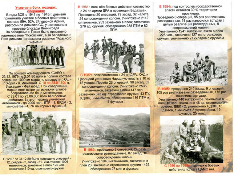 Наш полк прошел тяжелейшим памирским маршем, воевал, нес боевые потери. Там, в горах Памира и Гиндукуша , мы по настоящему поняли, что такое мужская дружба, боевое братство, мы стали единой боевой семьей.