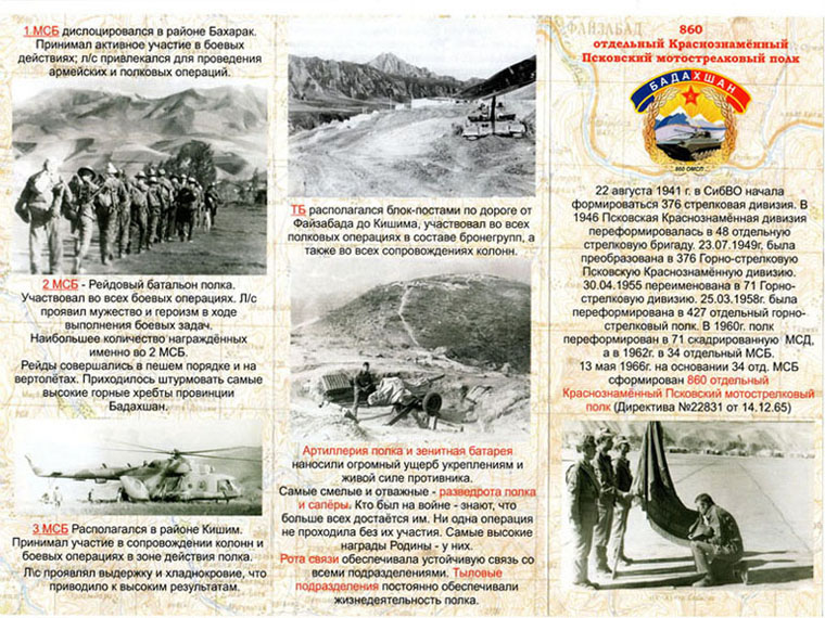 …860-й отдельный мотострелковый Псковский Краснознаменный полк под командованием подполковника Кудлай Виктора Семеновича, впервые в истории войн и военного искусства совершит высокогорный марш по Памиру, преодолев 11 перевалов, с боями пройдет 300 километровый марш по западному Памиру и войдет 28 января в столицу горного Бадахшана – Файзабад.