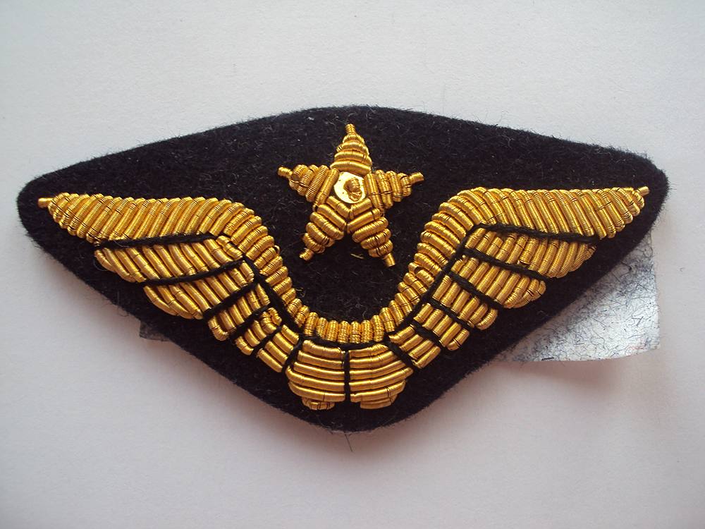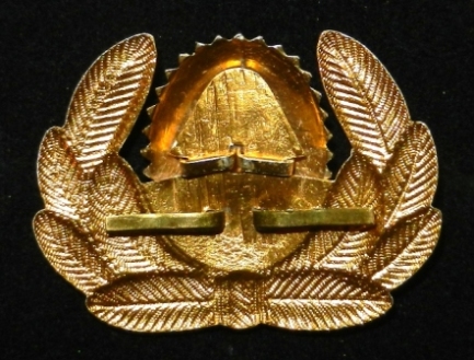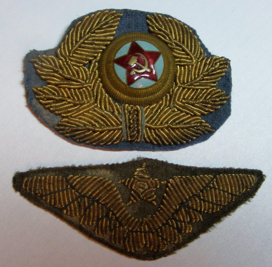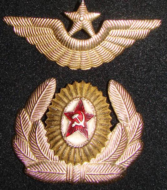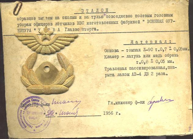 К круглой, металлической кокарде ВВС вводится металлический (латунь) венок (латунные кламеры припаиваются к реверсу венка), эмблема на тулью - латунная, сборная: звезда припаивается к крыльям, кламеры припаиваются к эмблеме.