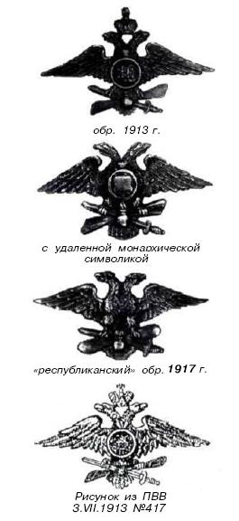 Во время Гражданской войны, как белые авиаторы, так и красвоенлеты, желая подчеркнуть принадлежность к авиации, использовали вместо кокард погонные "птицы" авиаторов РИА, у красвоенлетов встречаются главным образом орлы с вручную спиленными коронами и вензелем Николая II (на груди орла), реже - погонные крылатые пропеллеры и инженерные кокарды, в которых орел в венке заменяли погонным крылатым пропеллером малого размера, на тулью добавляли красную звездочку с плугом и молотом разной конструкции и размера. Фотографий с использованием на околыше "республиканского орла" (1917 г., Временного правительства), т.е. уже изготовленного без корон и вензеля, я, например, не видел!