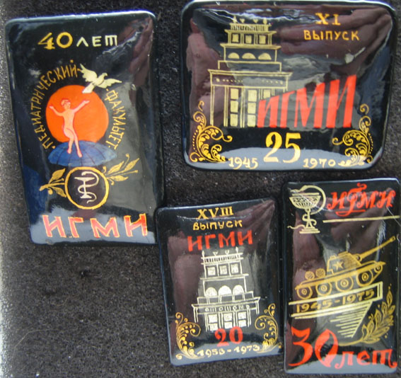 А теперь знаки. Сначала общего назначения - эмблемы института. Многие из них выполнены в технике Палеха.