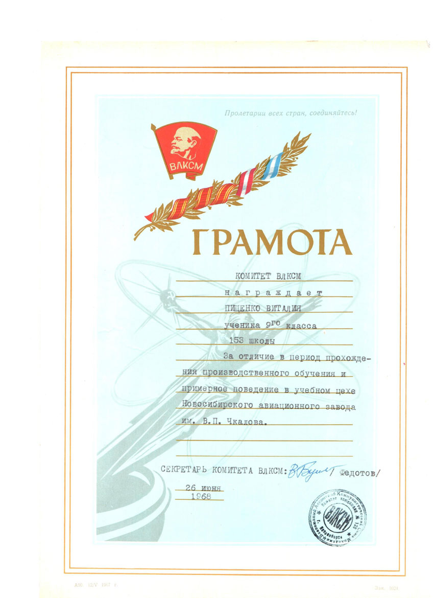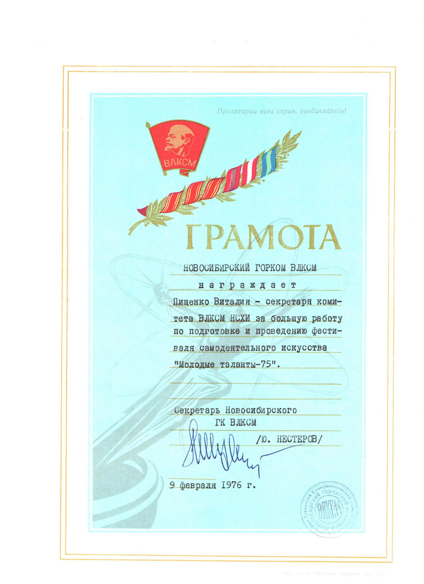-2 грамоты Новосибирского обкома ВЛКСМ (1968, 1976)