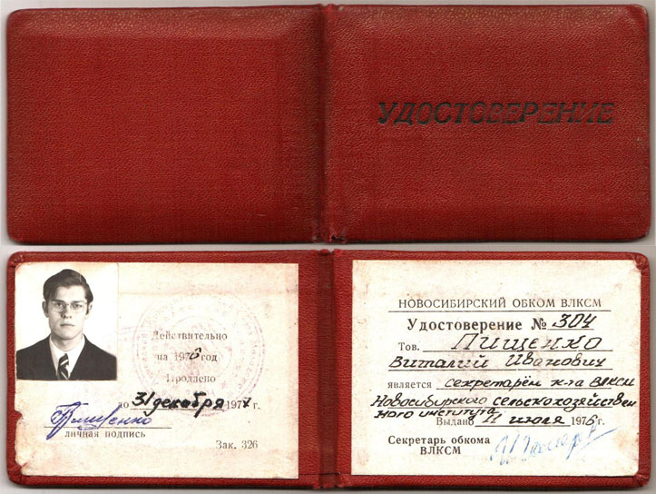 -удостоверение работника Новосибирского обкома ВЛКСМ (1976)