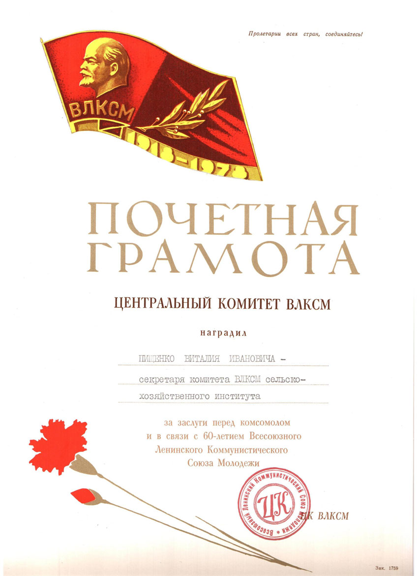 -2 грамоты ЦК ВЛКСМ (1978, 1978 к 60-летию ВЛКСМ)