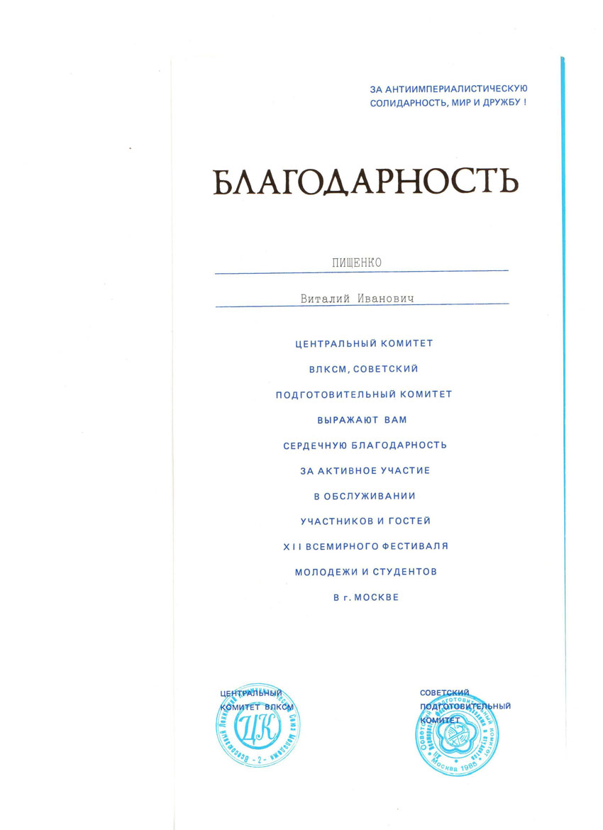 -Благодарность ЦК ВЛКСМ за подготовку 12 фестиваля молодежи и студентов