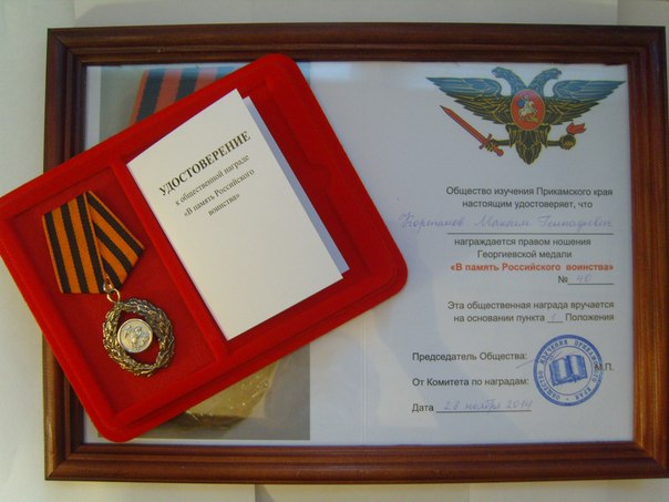 При награждении правом ношения медали «В память 100-летия Великой войны 1914-1918 гг.» жалуется Свидетельство, заверенное в Канцелярии Е.И.В.