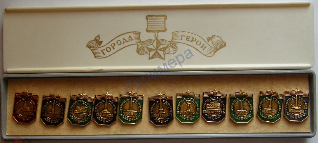 В 1965-том же - только Москва и Брестская крепость получили статус Города-героя и Крепости-героя соответственно, а так же медаль "Золотая Звезда" с орденом Ленина. Ленинград же, а так же Волгоград, Севастополь, Одесса и Киев - по сути уже были Городами-героями, и им автоматически были вручены соответствующие награды. Но это что касаемо статуса. По поводу серий - да, соглашусь, скорей всего сколько есть, сколько возможно увидеть и найти - столько по всей видимости и выпускалось, всмысле количество значков. Но, как известно, в каждом правиле есть свои исключения. Серии со Смоленском и Мурманском всё же были, одна серия - перевыпущена через 10 лет в коробке большего размера. Фото к сожалению только такого качества (P.S. Качественно сфотографировать - тоже целая наука), на самом же деле крышка и сама в целом коробка - почти кипельно-белого цвета, без желтизны.