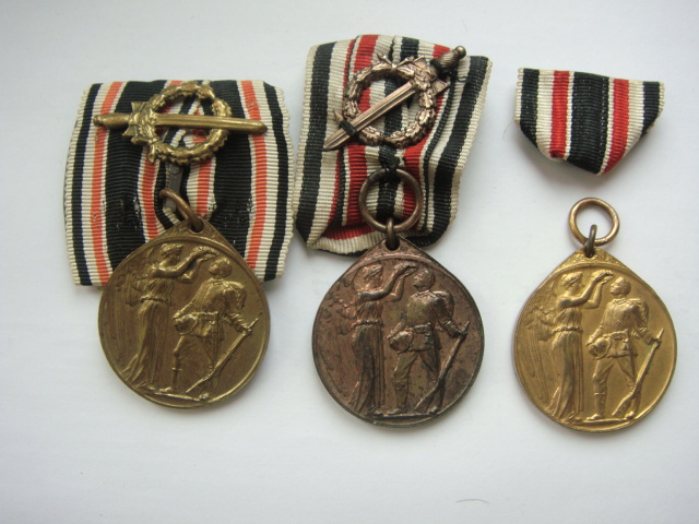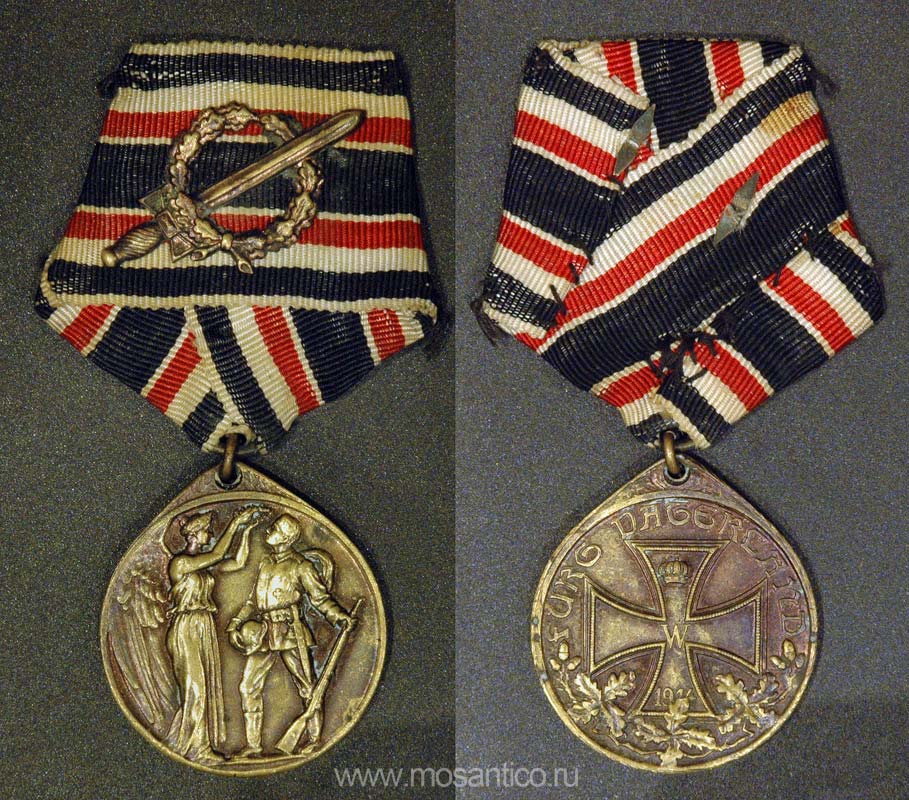 Немецкий почетный памятный знак Мировой войны, изготавливавшийся из позолоченной бронзы, носился на левой стороне груди на шелковой ленте цветом германского флага: белой с широкой центральной черной полосой шириной 8 мм, двумя 1 мм красными узкими по бокам и боковыми узкими 1 мм черными полосками.