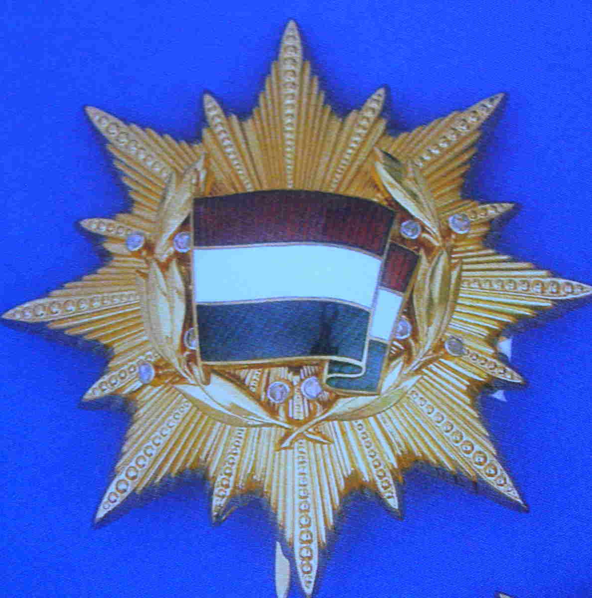 На шее; на ленте - знак ордена Звезды Индонезии, цепь ордена Ожерелья Нила.