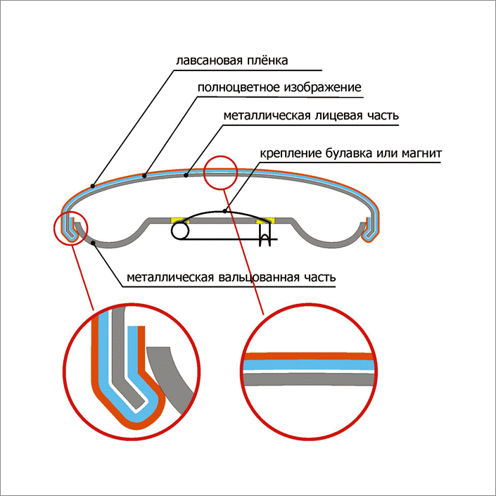 Технология производства закатных значков позволяет изготавливать даже небольшие партии больших и ярких значков.