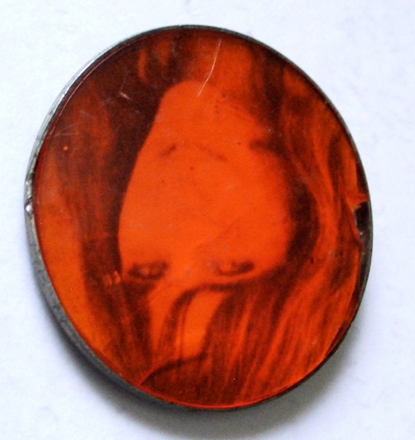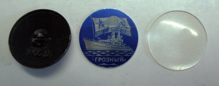 Корпус значка -(с буртиком для вставки линзы и последующей вальцовки для жесткой фиксации линзы) -металл (жесть) с вжатой в паз заколкой.