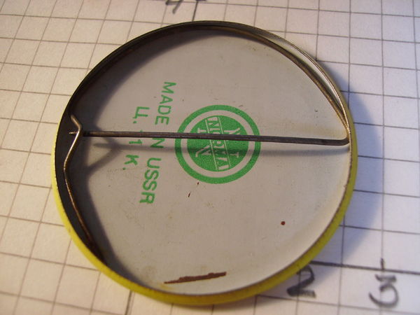 Корпус значка -(с буртиком для вставки линзы и последующей вальцовки для жесткой фиксации линзы) -металл (жесть) с вжатой в пазы заколкой.